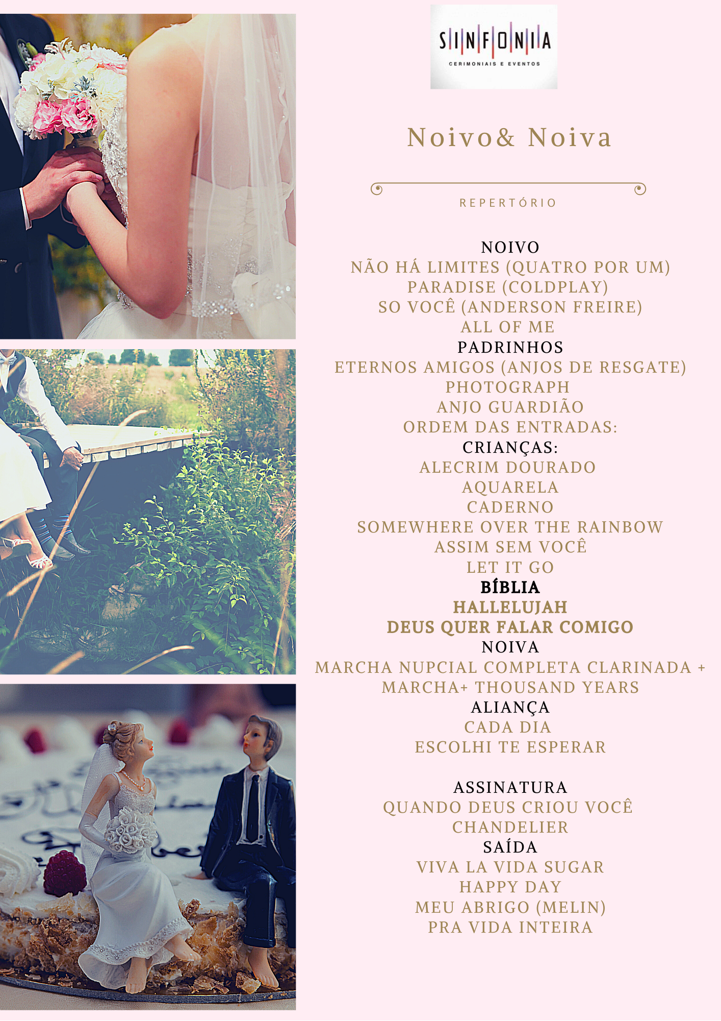 Nós do Grupo Sinfonia acreditamos que a música une coraçãos e cada casal vibra com um estilo diferente, estamos abertos as sugestões dos nossos clientes, para tornar a cerimônia inesquecível.
